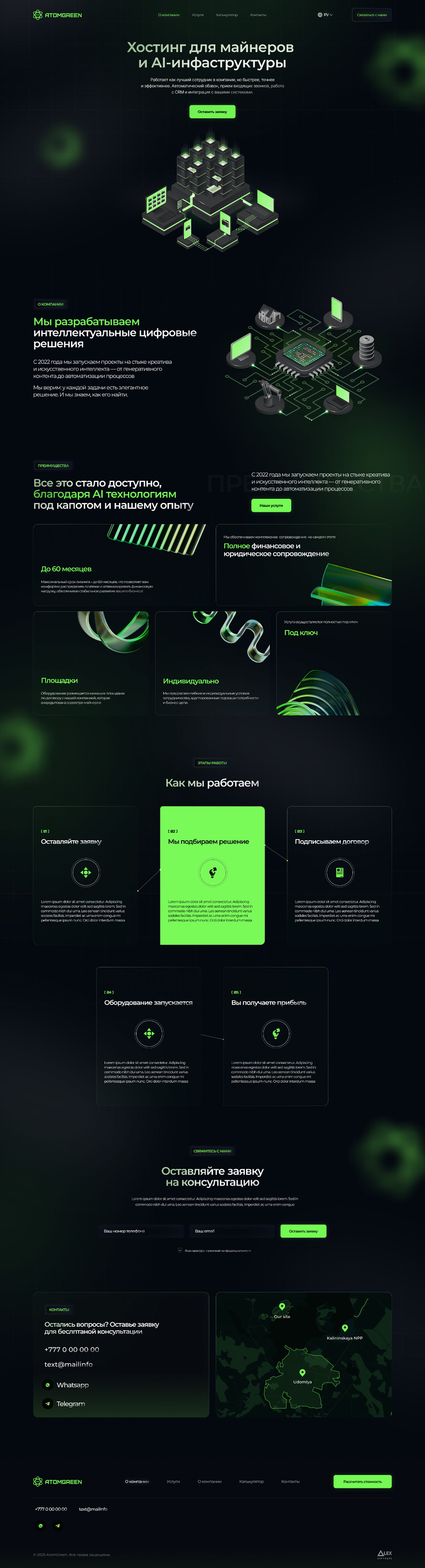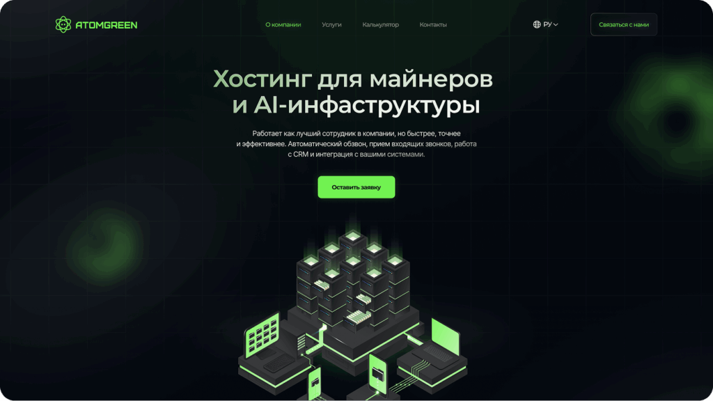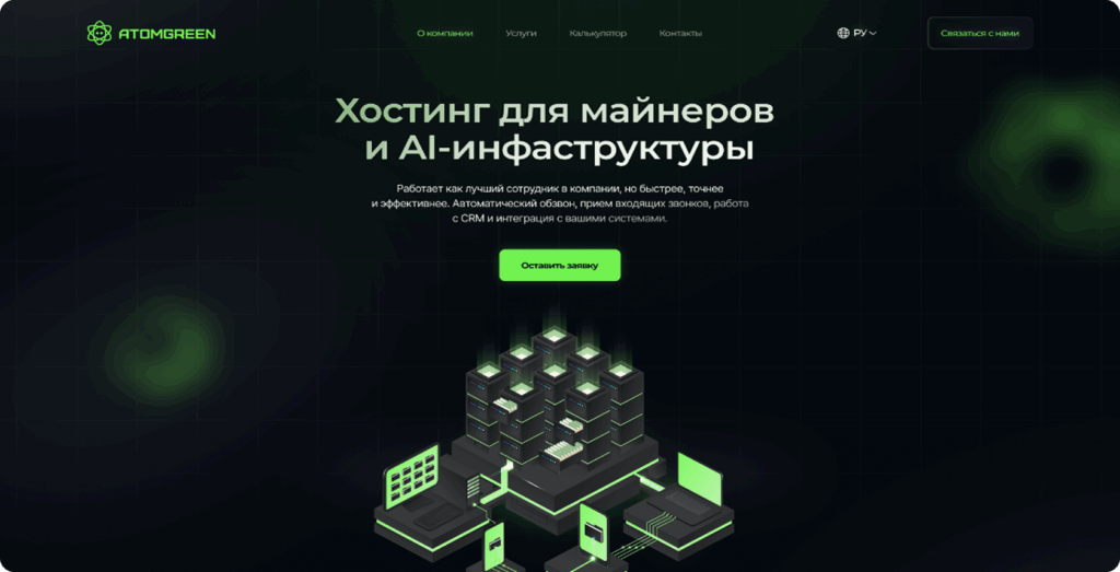 AtomGreen — это высокотехнологичный хостинг для майнеров и AI-инфраструктуры. Платформа обеспечивает стабильную работу, автоматический сбор данных, контроль энергозатрат и интеграцию с CRM-системами. Проект создан для компаний, которые ценят надёжность, эффективность и масштабируемость решений.