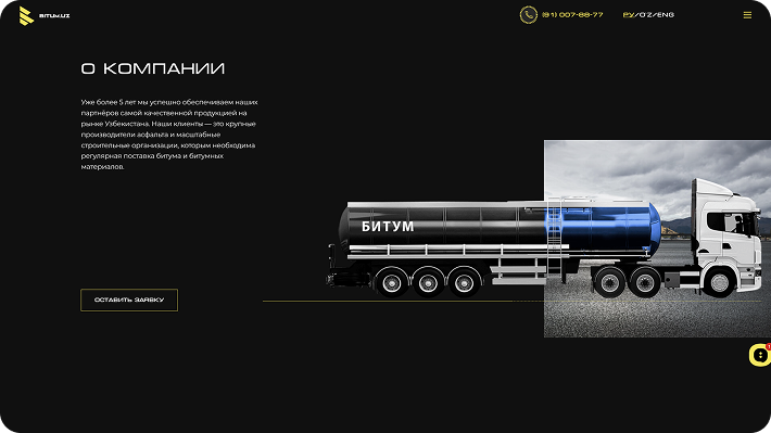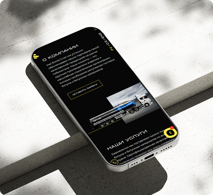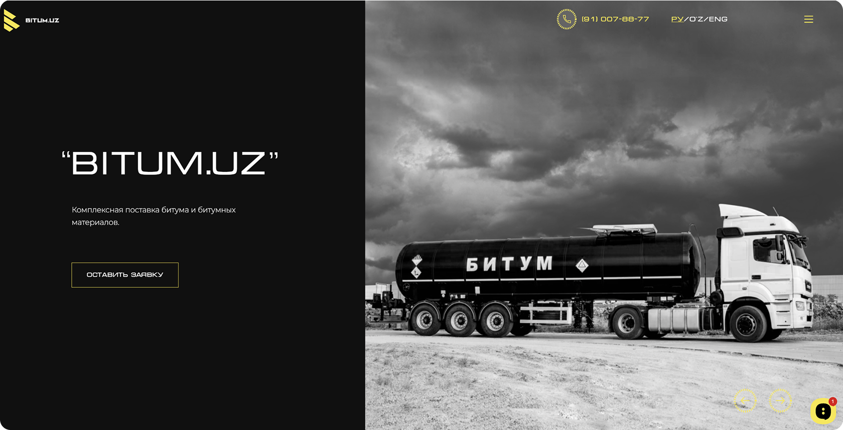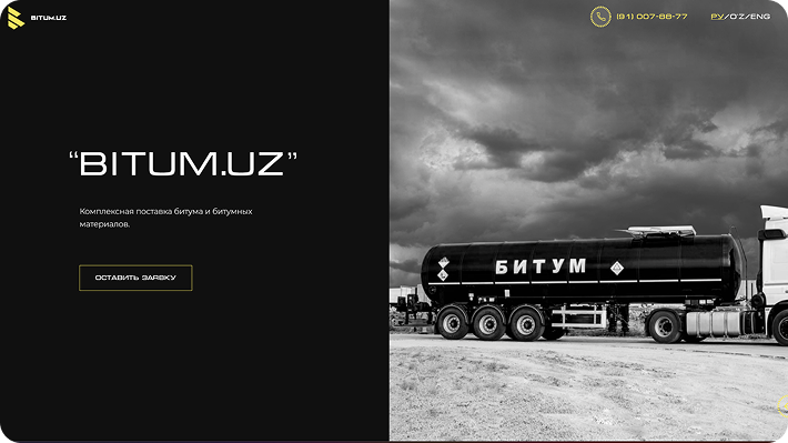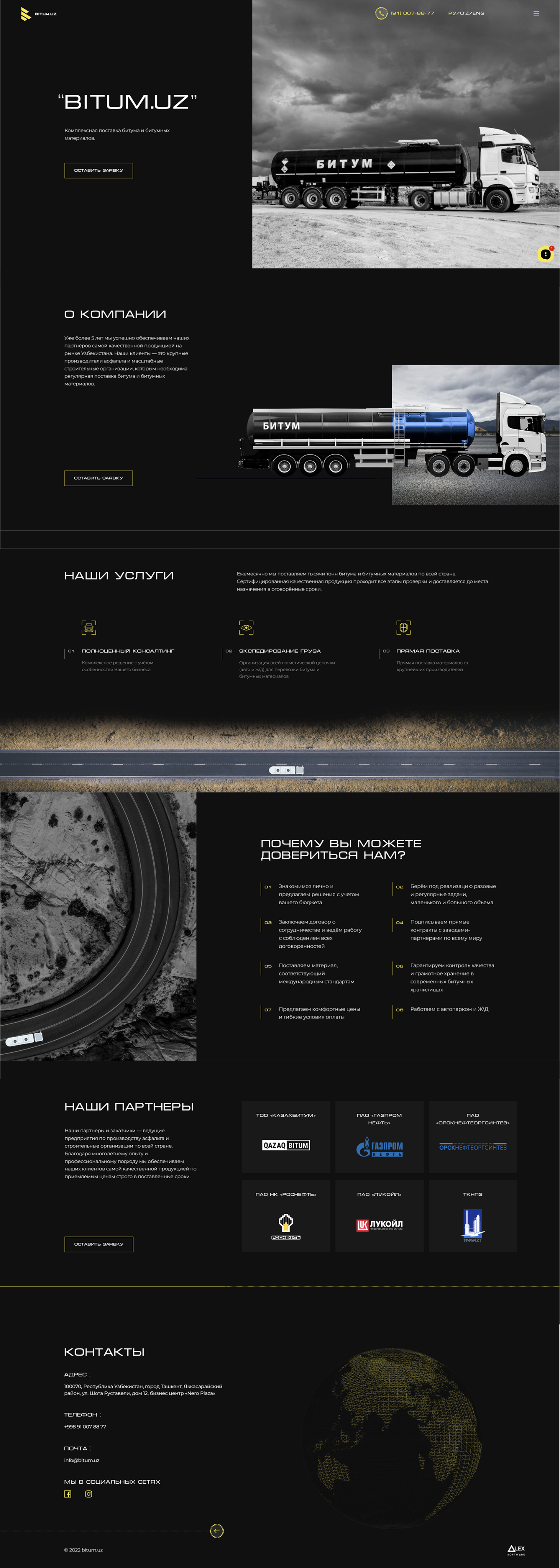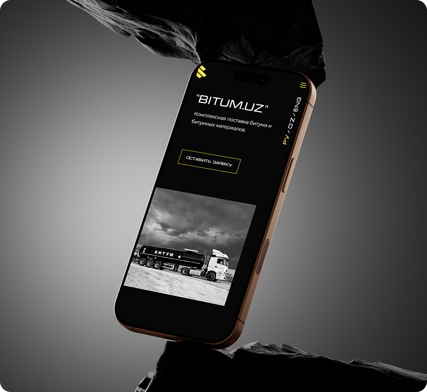 Bitum.uz — промышленная компания, специализирующаяся на производстве и поставке битумных материалов. Сайт разработан с акцентом на информативность и надёжность, демонстрируя технологичность, качество и масштаб предприятия. Проект подчёркивает доверие и профессионализм бренда.