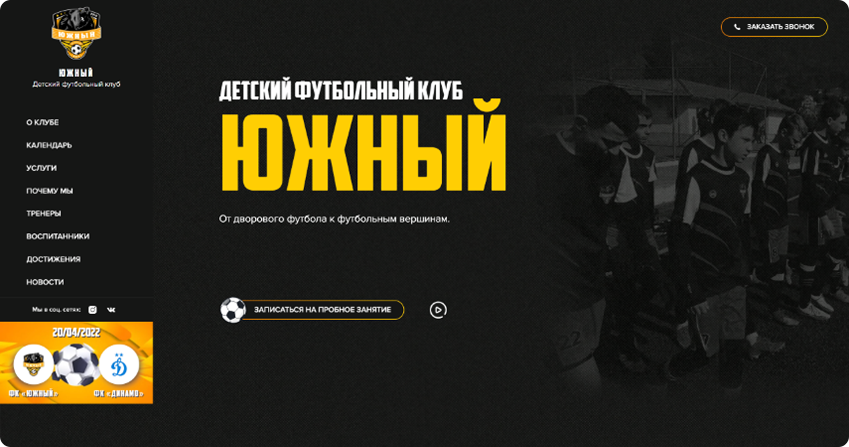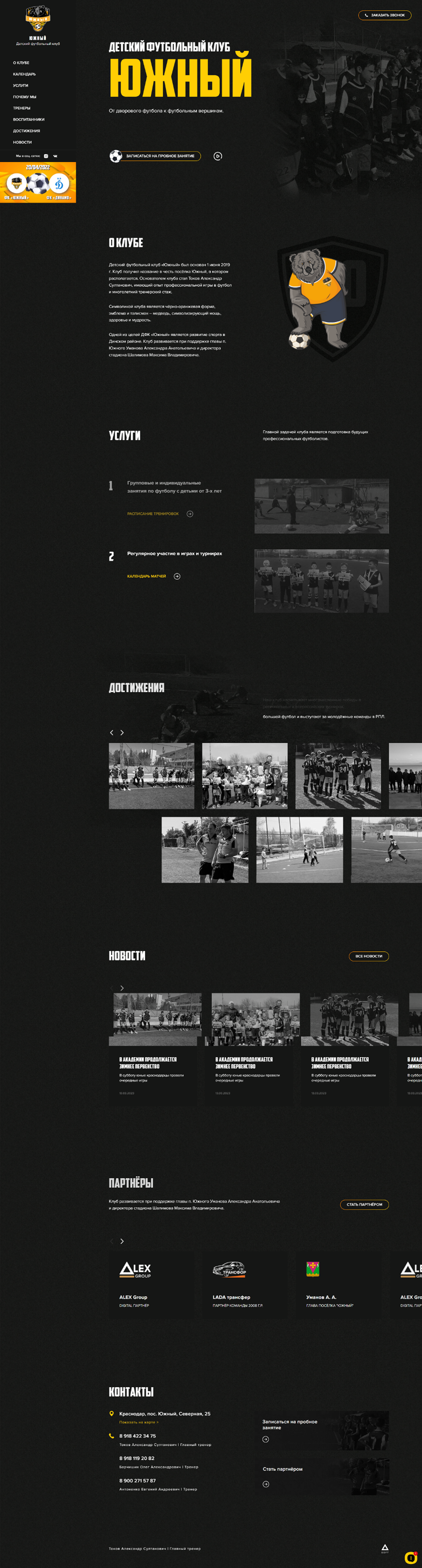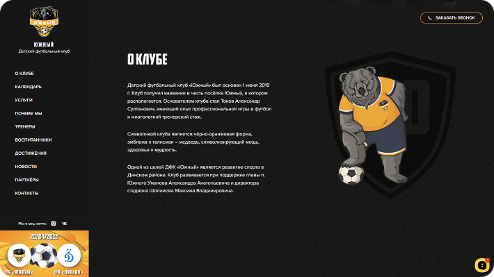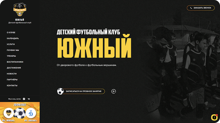Детский футбольный клуб «Южный» — это место, где юные спортсмены развивают свои навыки, командный дух и любовь к футболу. Проект создан для родителей и детей, чтобы легко находить информацию о тренировках, расписании и достижениях команды. Сайт вдохновляет на движение, спорт и победу.