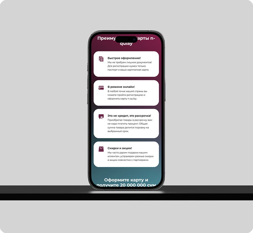 N-Qulay — сервис, созданный для удобства и комфорта пользователей. Проект объединяет простоту интерфейса, современный дизайн и понятную структуру, чтобы каждый мог быстро найти нужное решение. Всё продумано до мелочей — от визуала до функционала.